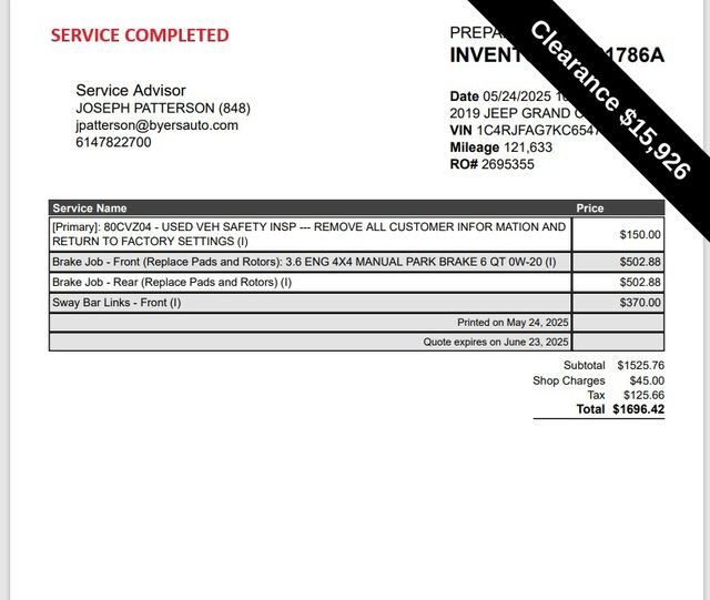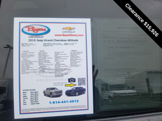 2019 Diamond Black Crystal Pearlcoat Jeep Grand Cherokee Altitude 4WD 3.6L V6 24V VVT This Jeep Grand Cherokee has many features and is well equipped including, Heated Seats, Apple CarPlay, Android Auto, Leather Seats, Sunroof/Moonroof, 1-Year SiriusXM Radio Service, 115V Auxiliary Power Outlet, 4G LTE Wi-Fi Hot Spot, 8.4" Touchscreen Display, ABS brakes, Altitude Grille, Altitude IV Package, Apple CarPlay, Auto-Dimming Rear-View Mirror, Automatic temperature control, Black Suede Seats w/Black Stitching, Body Color Claddings, Body Color Fascia, Body Color Shark Fin Antenna, Brake assist, Dark Day Light Opening Moldings, Dark Headlamp Bezel Finish, Dark Lens Taillamps, Electronic Stability Control, Four wheel independent suspension, Front Accent/Body Color Fascia, Front fog lights, Fully automatic headlights, Gloss Black Rear Fascia Applique, Google Android Auto, GPS Antenna Input, GPS Navigation, HD Radio, Heated Front Seats, Instrument Cluster w/Off-Road Disp. Pages, Integrated Center Stack Radio, Integrated Voice Command w/Bluetooth, Jeep Black Gloss Badging, Normal Duty Suspension, Panic alarm, ParkView Rear Back-Up Camera, Power 4-Way Driver Lumbar Adjust, Power 8-Way Driver/Manual Passenger Seat, Power Liftgate, Power Sunroof, Quick Order Package 2BZ Altitude, Radio: Uconnect 4C Nav w/8.4" Display, Rear Accent/Body Color Fascia, Rear Fascia Black MIC Step Pad, Security & Convenience Group, Security Alarm, Single Exhaust w/Bright Tip, SiriusXM Satellite Radio, SiriusXM Traffic Plus, SiriusXM Travel Link, Steering Wheel Mounted Audio Controls, Traction control, Universal Garage Door Opener, USB Host Flip, Wheels: 20" x 8.0" Gloss Black Aluminum.Priced below KBB Fair Purchase Price!Thank you for taking the time to look at this great 2019 Jeep Grand Cherokee. Please visit our website for a full list of available inventory. www.ByersChevy.com.