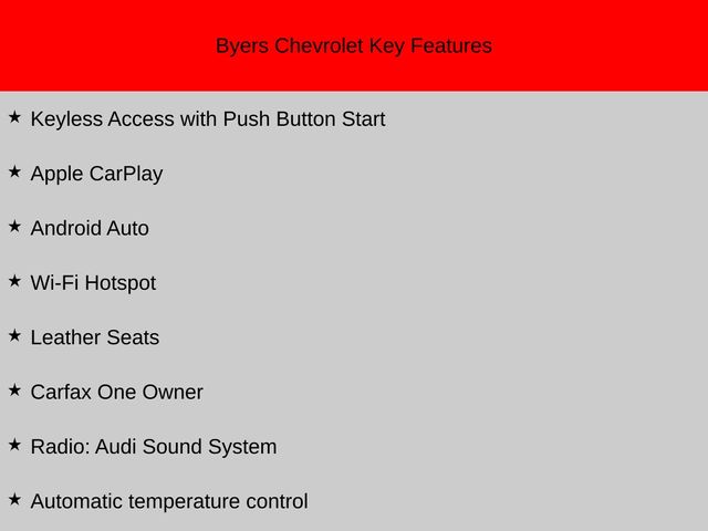 Get a free Carfax report at www.ByersChevy.com. 2024 Black Audi Q3 Premium S Line quattro quattro 2.0L 4-Cylinder TFSI Keyless Access with Push Button Start, Apple CarPlay, Android Auto, Wi-Fi Hotspot, Leather Seats, Carfax One Owner, ABS brakes, Audi smartphone interface (Apple CarPlay/Android Auto), Auto High-beam Headlights, Automatic temperature control, Brake assist, Electronic Stability Control, Emergency communication system: Audi connect CARE, Exterior Parking Camera Rear, Fully automatic headlights, Heated Front Bucket Seats, Leather Seating Surfaces, Power Liftgate, Power moonroof: Panoramic, Radio: Audi Sound System, Rear air conditioning, Traction control.Clean CARFAX. CARFAX One-Owner. 20/28 City/Highway MPGThank you for taking the time to look at this superb 2024 Audi Q3. Please visit our website for a full list of available inventory. www.ByersChevy.com.